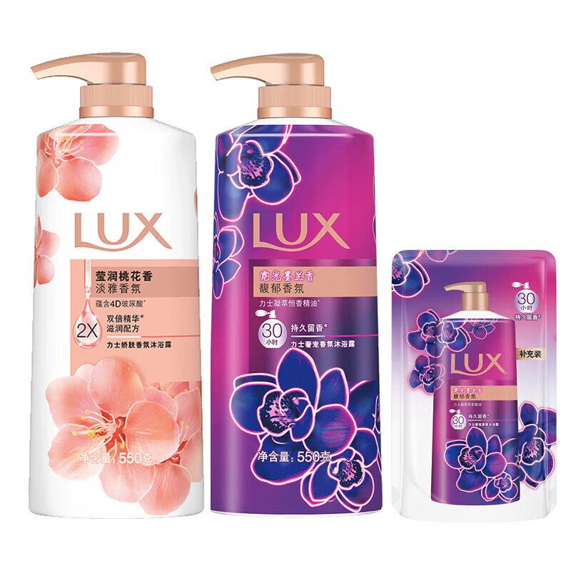 ¥39.9 力士(LUX)沐浴露套装 莹润桃花香550g+霓光墨兰香550g送沐浴露200g 49.9