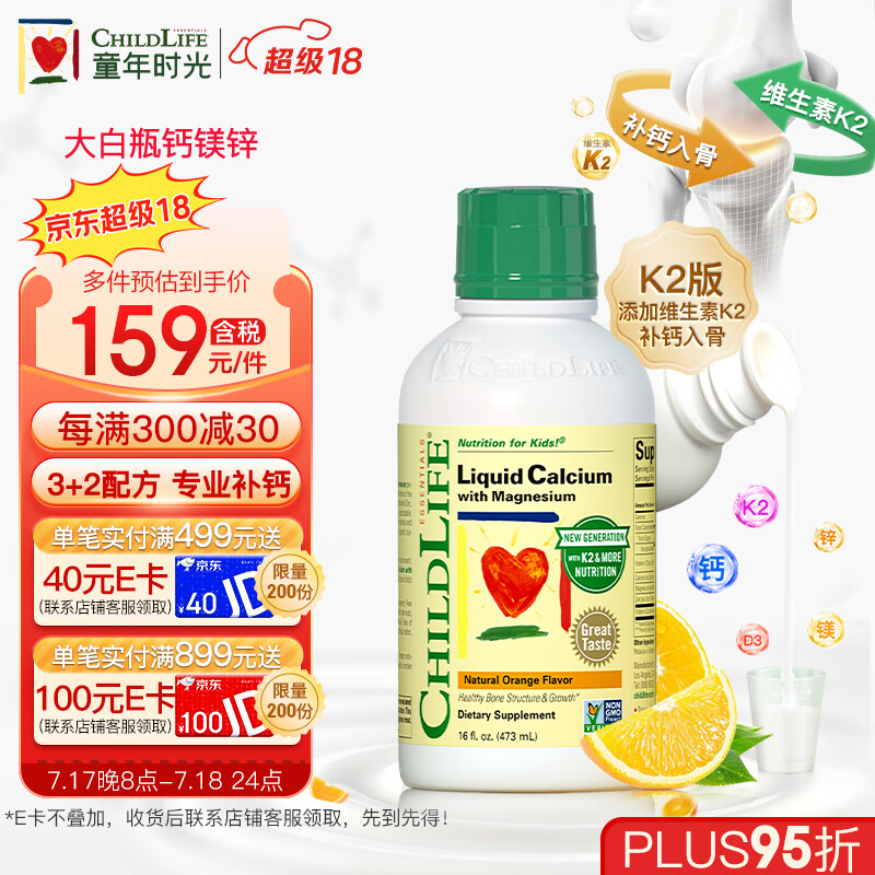 ¥165 ChildLife童年时光钙镁锌 柠檬酸液体钙 婴幼儿童补钙补锌乳钙 维生素K2+D3 进口 6个月+ 473ml/瓶 【单瓶】 185