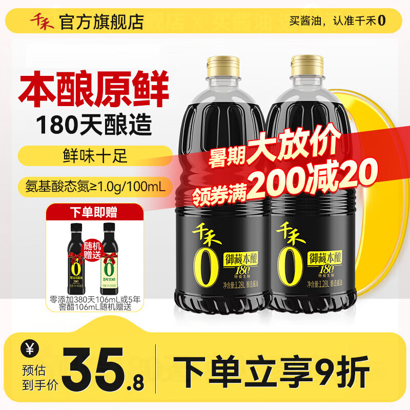 ¥35.55 千禾酱油0添加生抽调味品特级御藏本酿180天 【囤货装】1.28L*2瓶 39.55