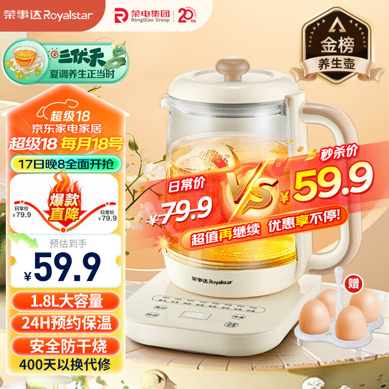 ¥49.9 荣事达(Royalstar)养生壶煮茶壶烧水壶电热水壶开水壶恒温壶玻璃花茶壶热奶器预约自动保温1.8L家用办公室YSH18L28 79.9