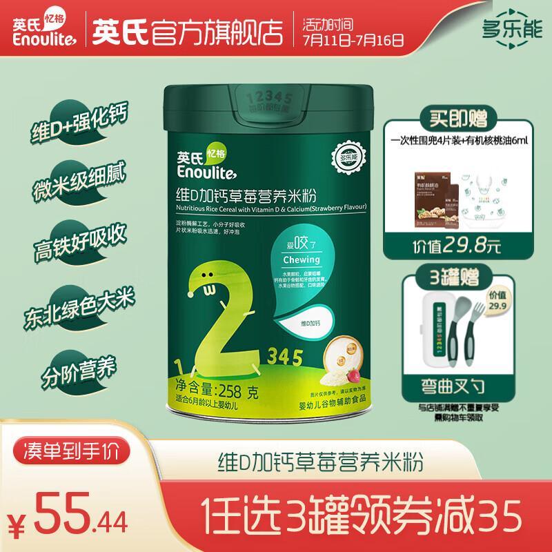 ¥57.77 英氏(Engnice)米粉婴儿高铁米粉米糊辅食宝宝婴幼儿6个月以上罐装 【2阶7月+】维D加钙草莓 258g 69.6