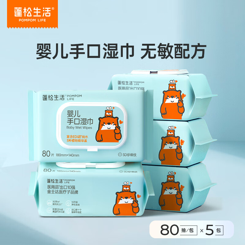 ¥26.9 蓬松生活婴儿湿巾便携随身装婴幼儿新生儿宝宝手口出行口袋学生湿纸巾小包 蓝色婴儿手口湿巾 80抽 5包 30.9