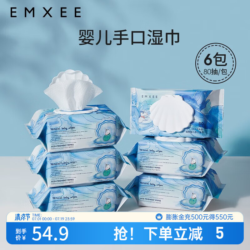 ¥53.9 嫚熙(EMXEE)婴儿湿巾白贝壳手口用宝宝新生儿屁屁加厚湿纸巾家用80抽 组合装 80抽 6包 140*188mm 59.9
