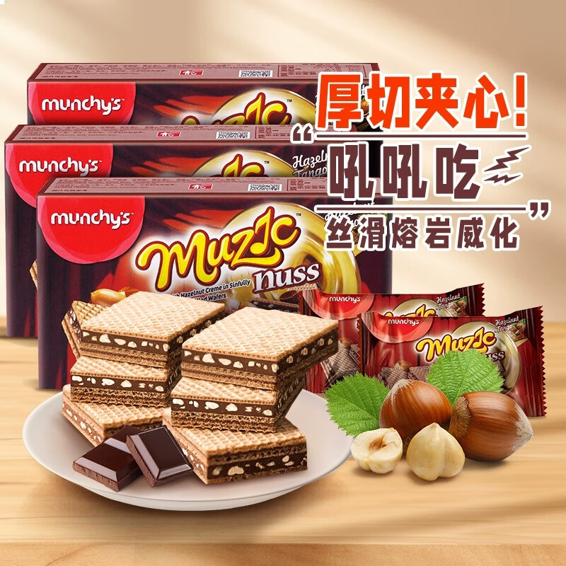 ¥19.9 马奇新新 马来西亚进口威化点心休闲零食夹心饼干多口味下午茶曲奇蛋卷 加厚榛子花生夹心威化81g*3 26.9