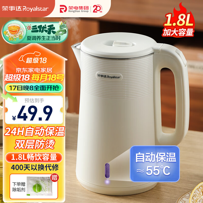 ¥29.9 荣事达(Royalstar)电热水壶1.8L自动保温烧水壶电水壶家用开水壶恒温壶304不锈钢饮水机热水壶电开水瓶 RS-KT1805B 49.9