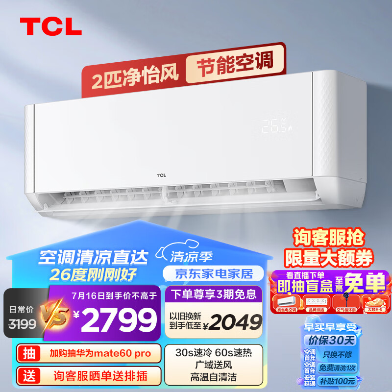 ¥2749 TCL空调 2匹 新三级能效 变频冷暖 净怡风 大风量 卧室壁挂式空调挂机 KFR-51GW/JQ2Ea+B3以旧换新 2799