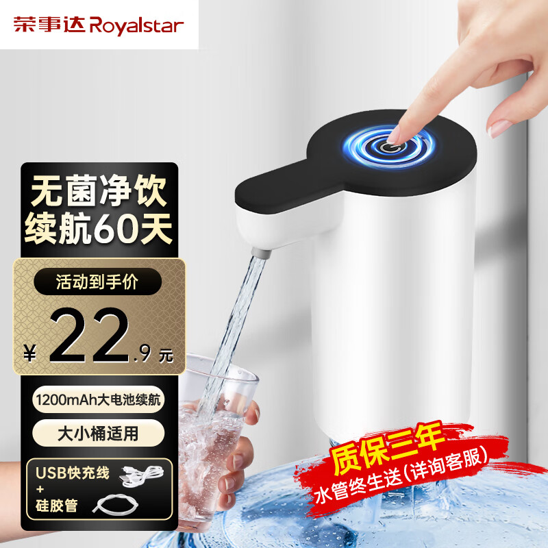 ¥15.9 荣事达(Royalstar)桶装水抽水器家用电动压水器纯净水桶取水器抽水泵饮水机抽水器 一体白(1200大电池+续航60天) 22.9