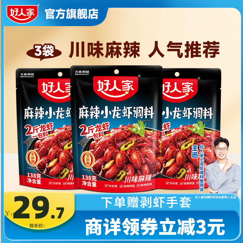 好人家麻辣小龙虾调料138g*3袋,到手23.7元