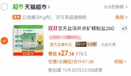 在售价74.9元,领1元券,标题下领129-35猫超卷,叠88vip+金币+2元福袋,叠凑单2件,折主商品27.14元包邮,返15元赠金;