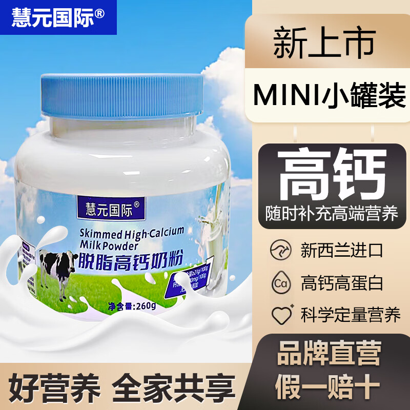 ¥14.9 慧元国际蓝胖子奶粉脱脂高钙成人奶粉儿童学生中老年奶粉0蔗糖新西兰进口 【小罐试喝】260g*1罐 49.9