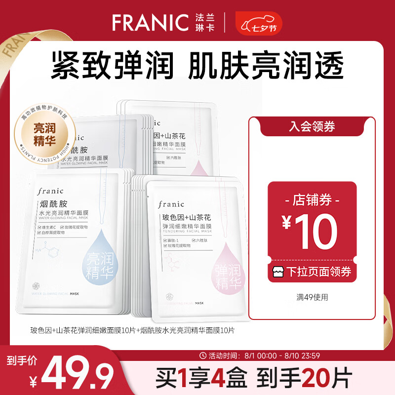 ¥19.9 法兰琳卡(FRANIC)玻色因山茶花弹润细嫩精华面膜女补水保湿紧致七夕情人节礼物 【提亮10片+紧致10片】 49.9