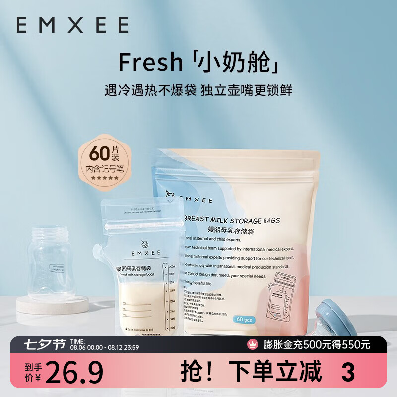 ¥25.9 嫚熙(EMXEE) 储奶袋母乳保鲜袋一次性存奶袋储存袋加厚防漏可冷冻 双轨密封60片 200ml 29.9