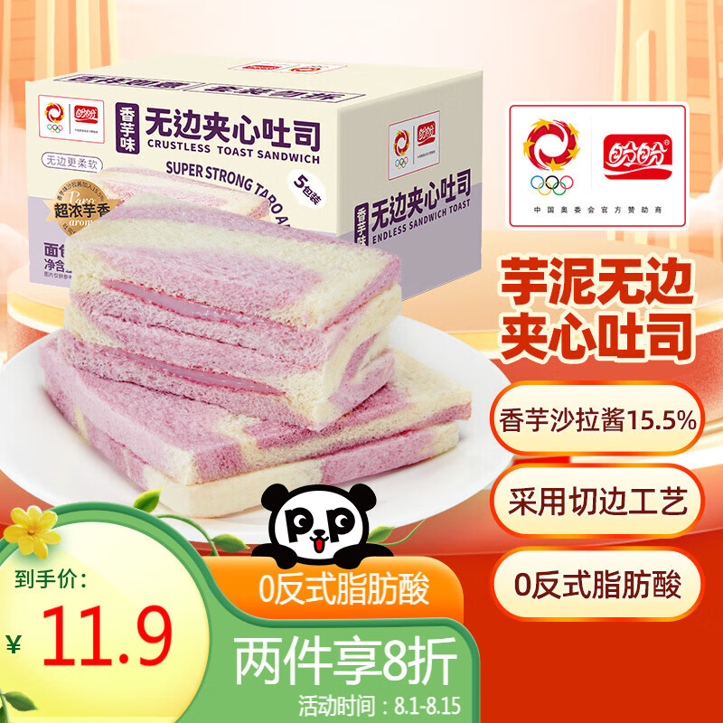 ¥10 盼盼芋泥无边夹心吐司 面包三明治早餐休闲零食下午茶点心 300g/箱 12