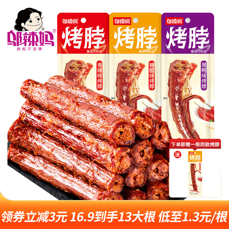 ¥16.9 邬辣妈手撕烤脖整根卤味零食宿舍办公室解馋休闲食品湖南特产 黑鸭味12根约 456g 赠黑鸭味1根 19.9
