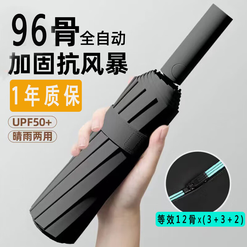 ¥28.2 荣菲96骨雨伞大号加固加厚结实抗风男士便携晴雨两用全自动遮阳伞女 96骨黑胶款升级三代-黑色 29.2