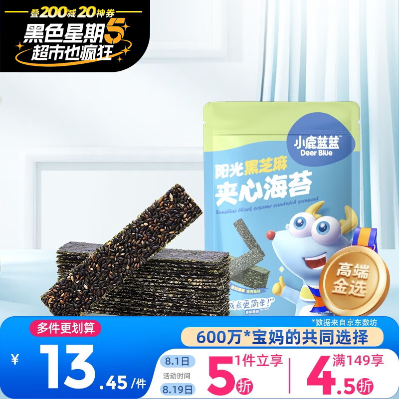 ¥13.45 小鹿蓝蓝黑芝麻海苔夹心脆 鲜脆儿童零食宝宝海苔酥脆口感即食 40g 26.9