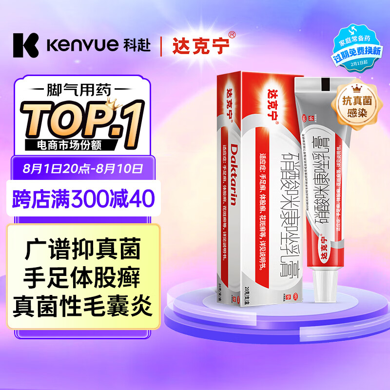 ¥16.95 达克宁硝酸咪康唑乳膏20g治脚气药止痒脱皮烂脚丫真菌感染止痒烂脚丫药脱皮糜烂脚趾缝烂痒专用药咪康唑散 20.95