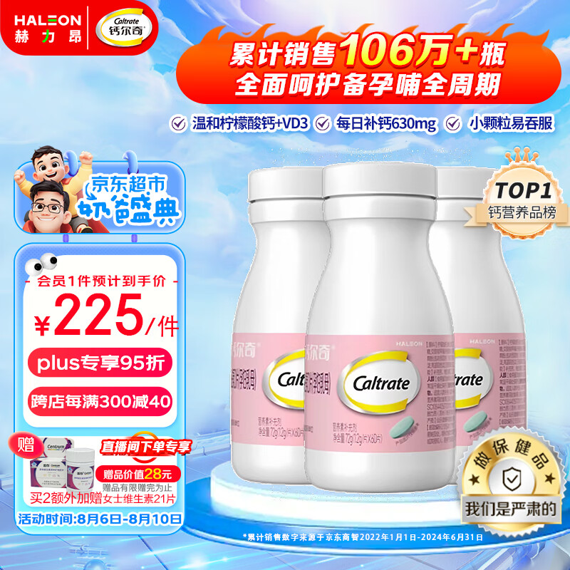 ¥295 钙尔奇孕妇钙片 柠檬酸钙成人钙片 备孕+孕早+孕中+孕晚+哺乳期钙片孕妇补钙+维生素D3含钙高 60片*3瓶 2月装 305