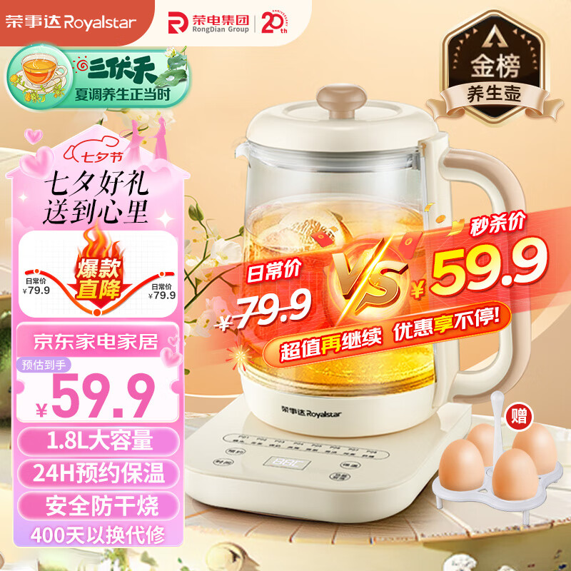¥59.9 荣事达(Royalstar)养生壶煮茶壶烧水壶电热水壶开水壶恒温壶玻璃花茶壶热奶器预约自动保温1.8L家用办公室YSH18L28 69.9