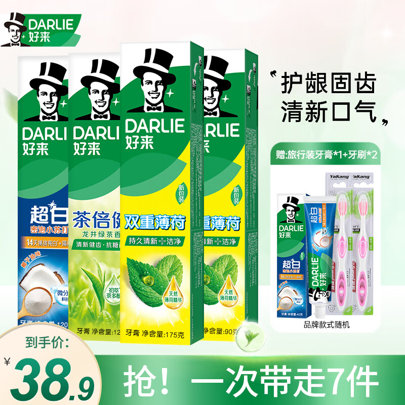 ¥49.9 好来(DARLIE)(原黑人)牙膏超白茶倍健双重薄荷黄牙垢烟牙渍清新口气净白 清新家庭装505g 59.9