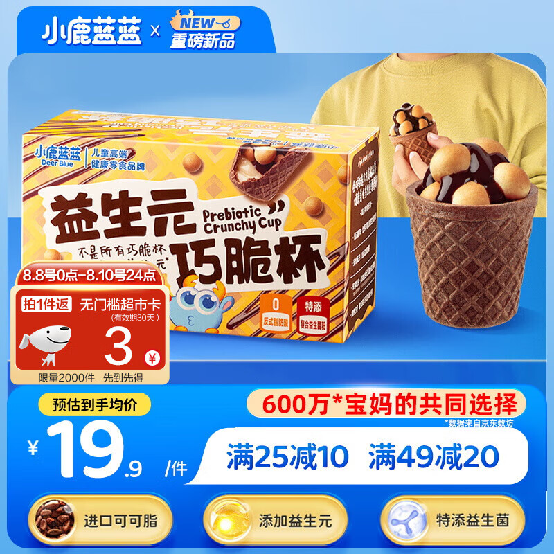 ¥19.9 小鹿蓝蓝儿童巧脆杯140g儿童夹心饼干巧克力零食脆脆杯纯可可脂 29.9