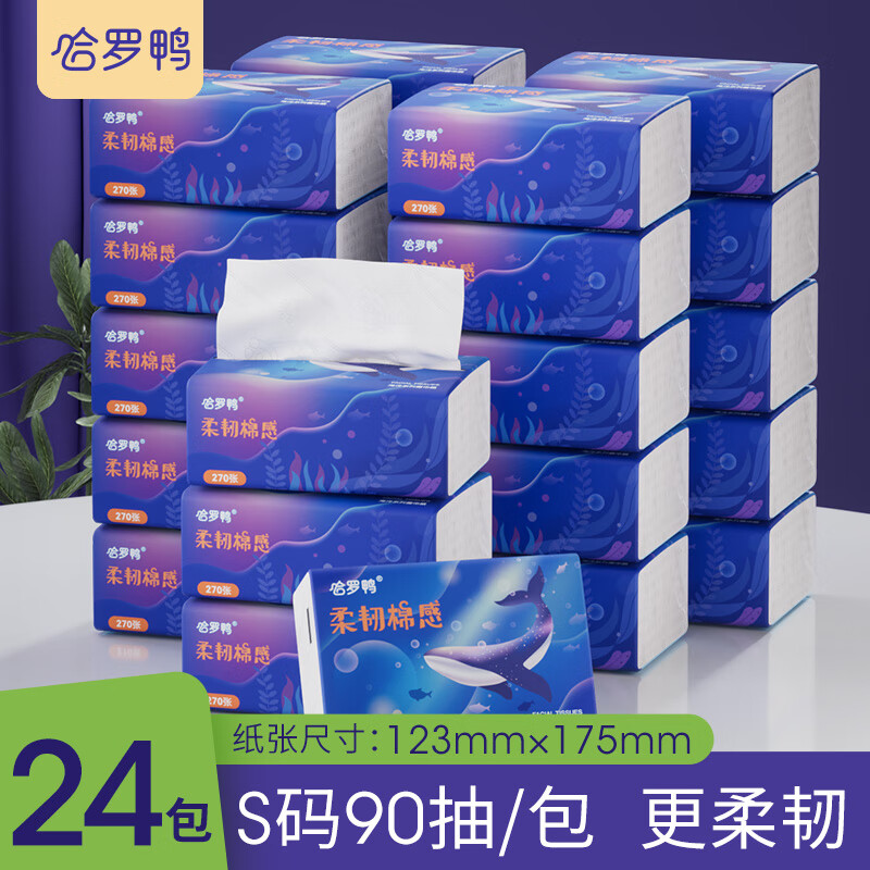¥17.9 哈罗鸭抽纸 超韧三层 湿水不易破 卫生纸 纸巾 餐巾纸 整箱 柔韧90抽*24包 38.9