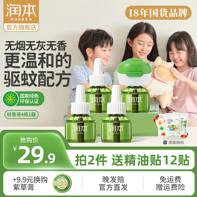 ¥24.9 润本(RUNBEN)电热蚊香液无味儿定时驱蚊器驱蚊液防蚊水电蚊液补充装无香型 4瓶 +1器【一房用一夏】非定时款 29.9