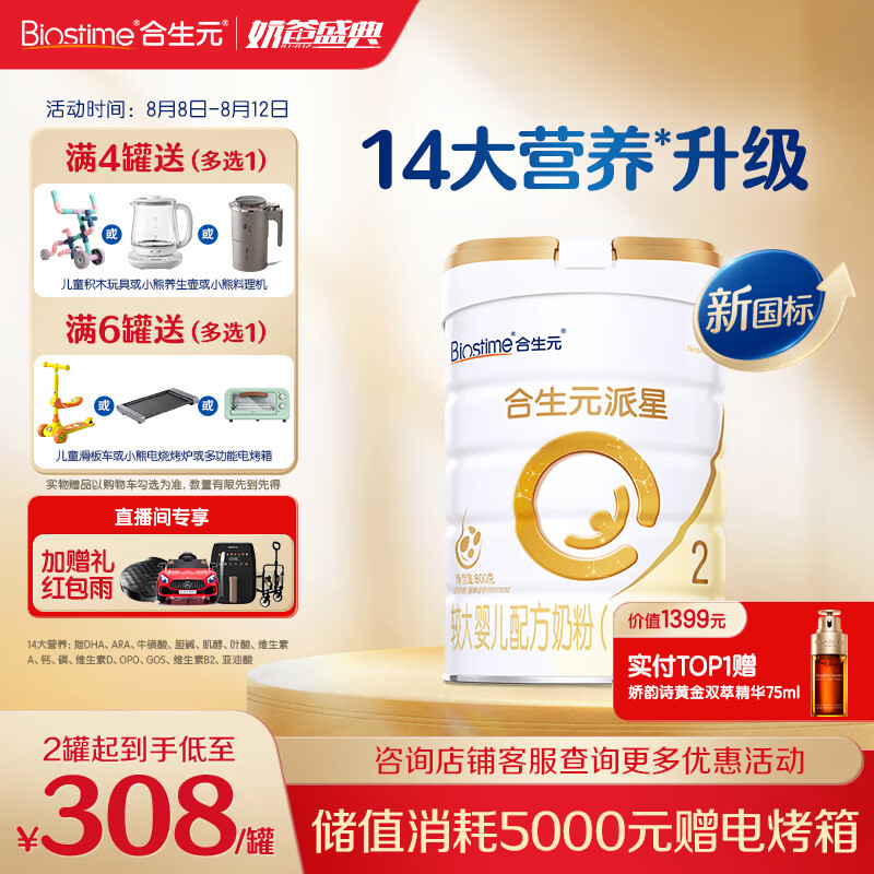 ¥292.4 合生元(BIOSTIME)派星 较大婴儿配方奶粉 2段(6-12个月) 新国标 800g 361.4