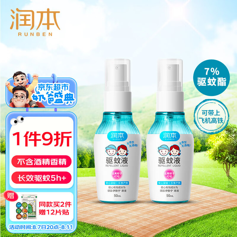 ¥12.9 润本(RUNBEN)驱蚊液驱蚊喷雾50ml×2支儿童宝宝蚊虫叮咬防蚊花露水7%驱蚊酯无香 22.9