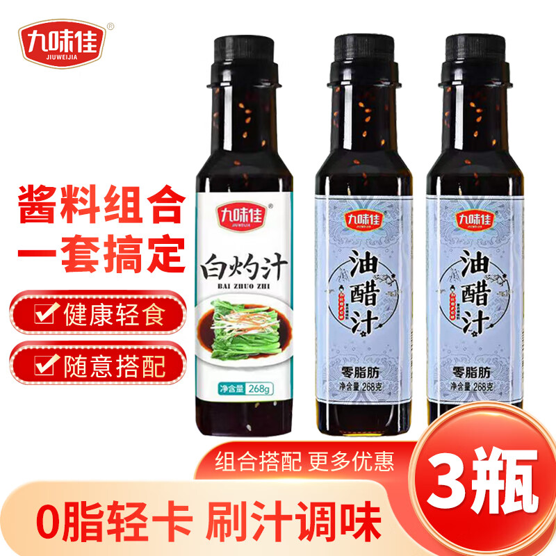 ¥9.9 九味佳白灼汁清蒸鱼白灼大虾白灼菜心葱油凉拌汁海鲜0脂调味汁 油醋汁2瓶+白灼汁1瓶268g 26.9