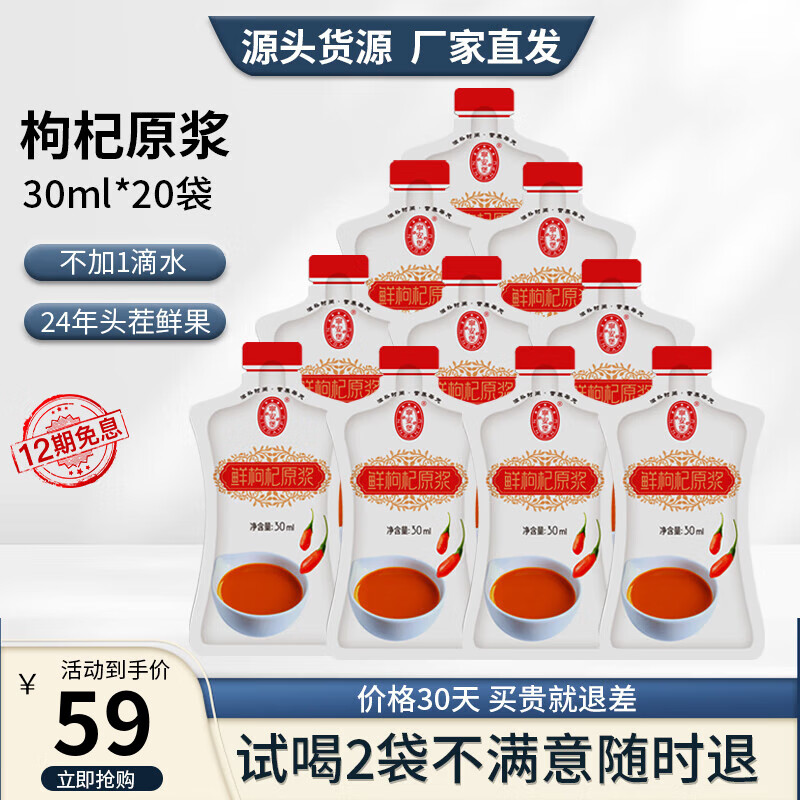 ¥29.9 宁安堡枸杞原浆 宁夏中宁头茬枸杞子NFC鲜果鲜榨0添加24年新货 600ml 30ml*20袋 59.9