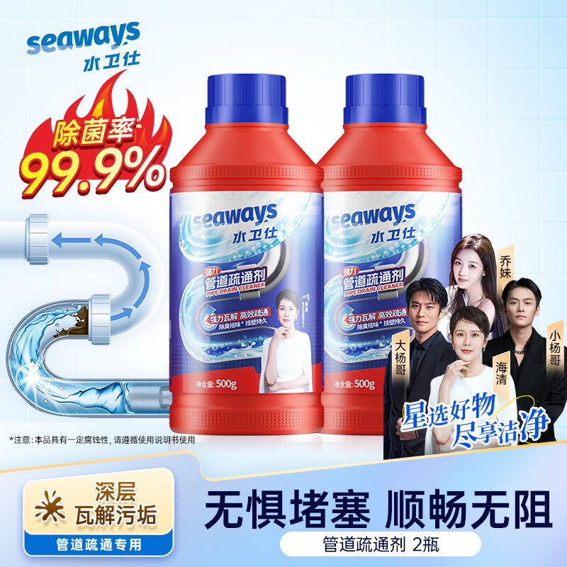 ¥19.9 水卫仕(seaways)管道疏通剂 下水道疏通剂 厨房马桶卫生间管道强力疏通剂 2瓶轻便装(轻松解决管道堵塞) 49.9