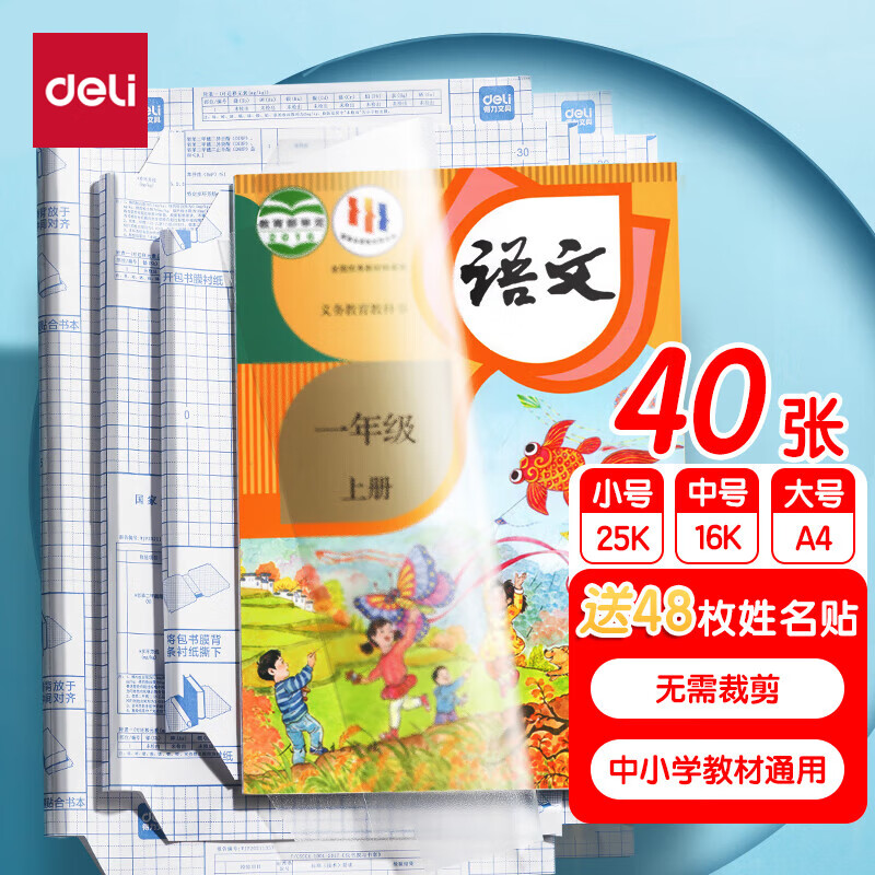 ¥13 得力(deli)40张多规格包书皮 透明书套小学生开学文具切角自粘环保磨砂防水多规格 带48枚姓名贴 23