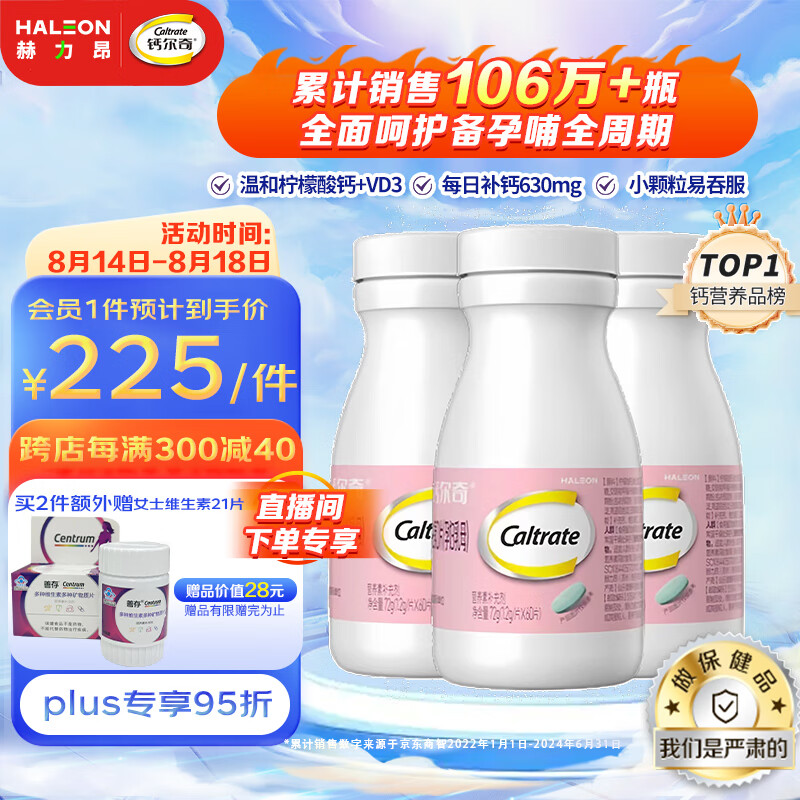 ¥237.7 钙尔奇孕妇钙片 柠檬酸钙成人钙片 备孕+孕早+孕中+孕晚+哺乳期钙片孕妇补钙+维生素D3含钙高 60片*3瓶 2月装 247.7