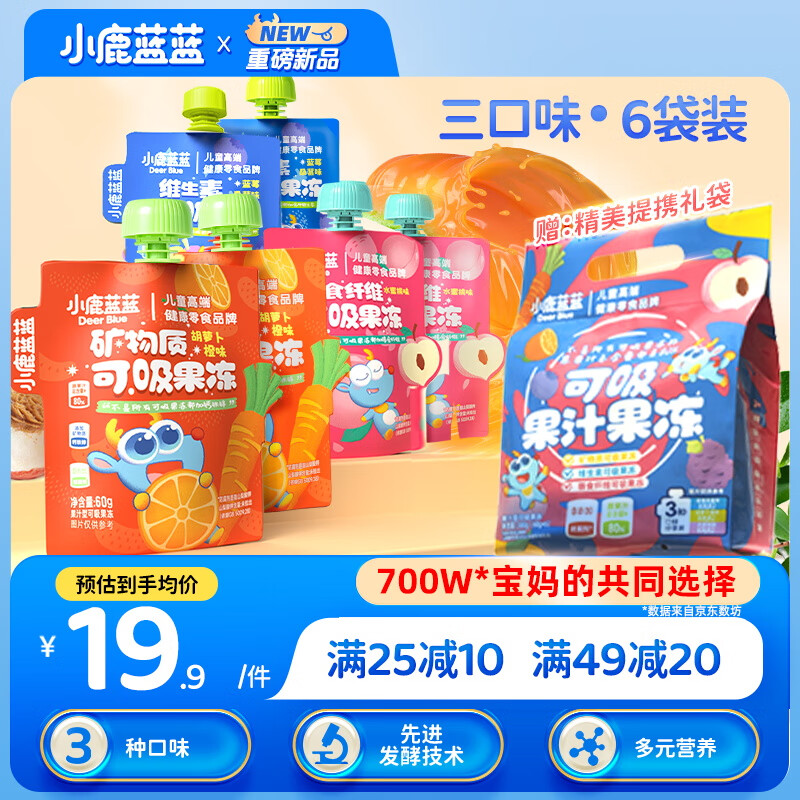 ¥19.9 小鹿蓝蓝 宝宝零食可吸果冻组合多口味含6袋 儿童果汁蓝莓水蜜桃果冻360g 29.9