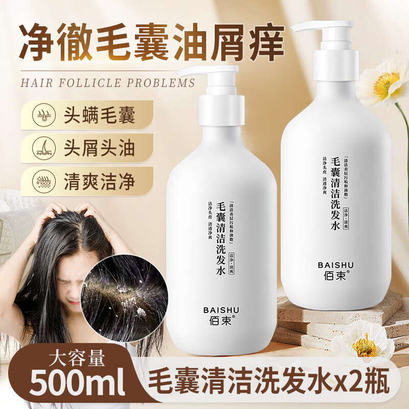 ¥19.9 佰束毛囊清洁洗发水头屑头痒头油螨虫清洁清爽柔顺留香蓬松洗发水女男 毛囊清洁洗发水, 500ml 2瓶 49.9