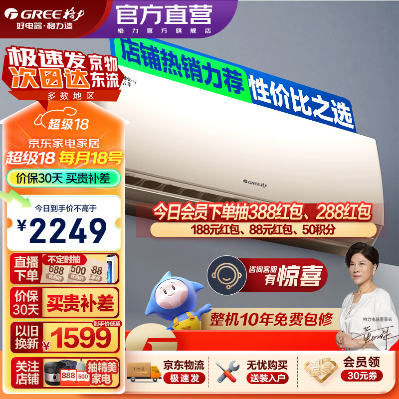 ¥2049 格力(GREE)空调 云佳【超级省电】 新能效 变频冷暖 自清洁 壁挂式 卧室空调挂机 大1匹 三级能效 珊瑚玉色 2249