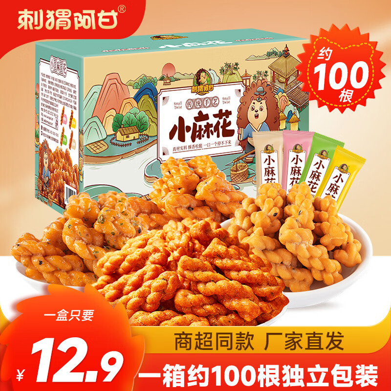 ¥9.9 刺猬阿甘 【4种口味】零食下午茶花椒香葱芝麻味小麻花360g约100个 混合口味 360g 1箱 约100根 29.9