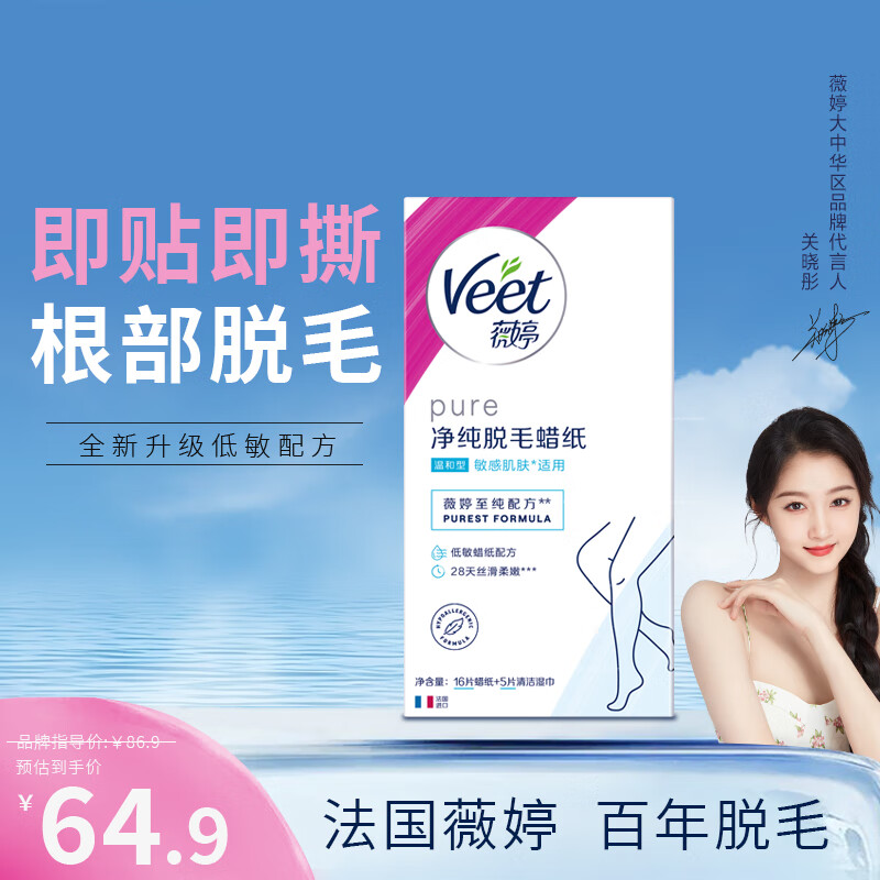 ¥61.9 薇婷Veet脱毛蜡纸 娇嫩肌肤适用16片大容量 男女士学生通用 蜜蜡脱毛 64.9