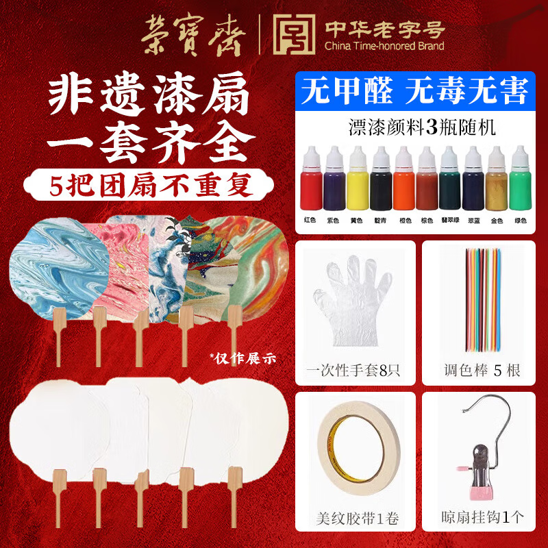 ¥29.8 【自营包邮】荣宝斋 漆扇 无甲醛颜料团扇 3色漂漆工具全套【5把团扇大号+三色颜料+材料】 38.8