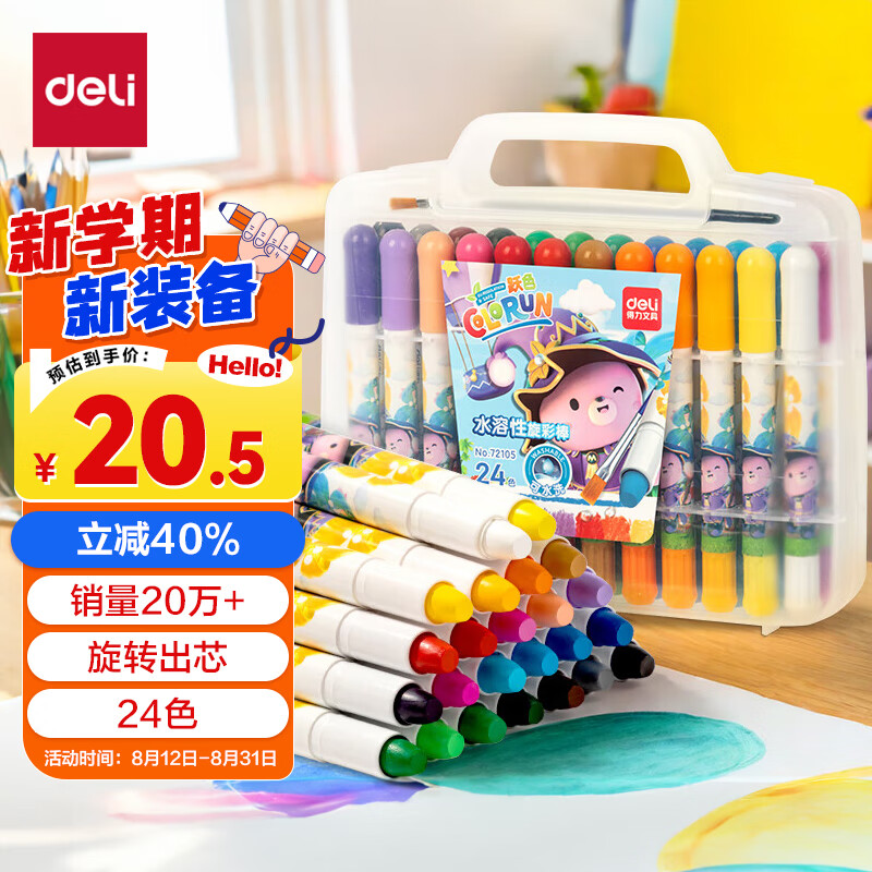 ¥16.9 【学生开学】得力(deli)水溶性油画棒24色可水洗旋转出芯蜡笔炫彩棒套装幼儿画画彩色绘画用品女孩儿童礼物 19.9