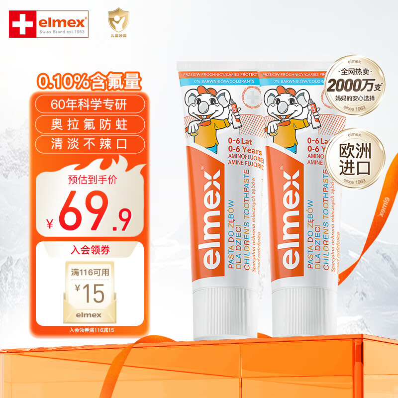 ¥59.8 ELMEX艾美适0-6岁儿童牙膏含氟防蛀易洁净低泡瑞士原装进口 50ml*2 0-6岁儿童牙膏 89.8