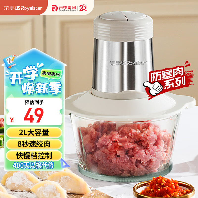 ¥49 荣事达(Royalstar)绞肉机家用电动多功能料理机切菜婴儿辅食机碎肉搅肉机饺子肉馅蒜蓉机RS-JR30R5【玻璃碗1副刀】 59