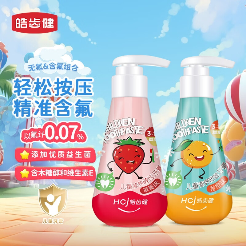 ¥35.6 皓齿健3-12岁儿童牙膏套装240g液体按压式(草莓+香橙)微含氟防蛀固齿 36.6