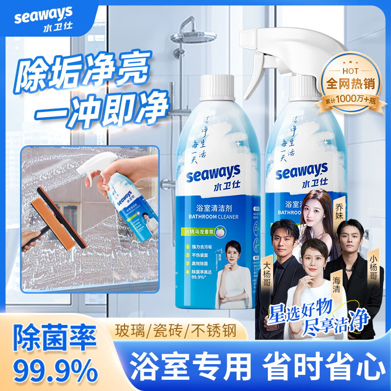 ¥15.9 水卫仕(seaways)浴室清洁剂 玻璃清洁剂瓷砖浴缸水龙头花洒除水垢清洁剂除菌 浴室清洁剂500g*2瓶 25.9