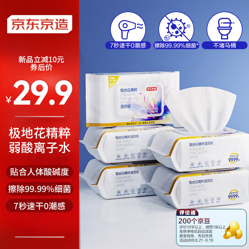 ¥27.9 京东京造极地花湿厕纸80片*5包厕纸湿巾大包家庭装 清洁湿纸巾湿巾 39.9