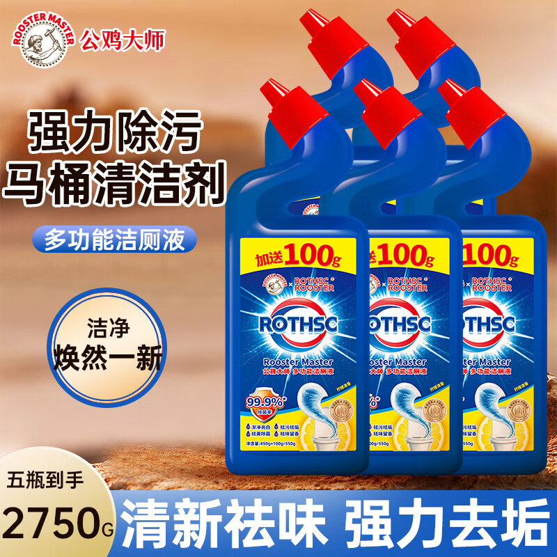 ¥39.9 公鸡大师洁厕灵除臭除菌去异味黄渍装强力除污马桶清洁剂清香型洁厕液550g 8倍除垢【立省34】 550g 5瓶 49.9