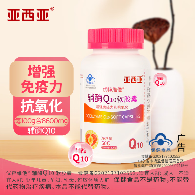 ¥59 【药房同售】亚西亚 辅酶Q10软胶囊500mg 心脏增强免疫力 抗氧化双重保健品 辅酶Q10*120粒 125