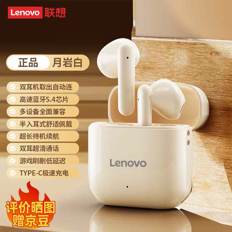 ¥59 联想真无线蓝牙耳机降噪半入耳式降噪蓝牙耳机运动音乐耳机蓝牙耳机超长续航大电量超强音质 EA100月岩白 63