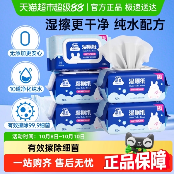 21元包邮!洁云 加大湿厕纸80片5包擦屁屁湿纸巾可冲马
